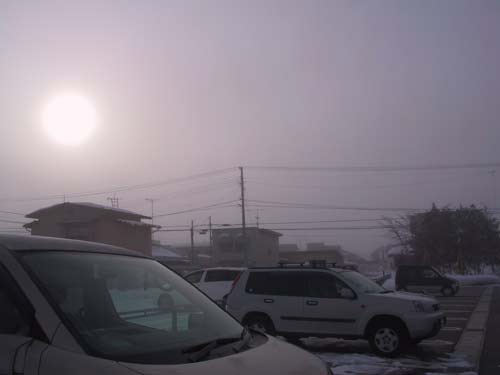 | 車のガラスが模様すりガラスみたいに! | クリニックも霧に覆われ・・・。 |