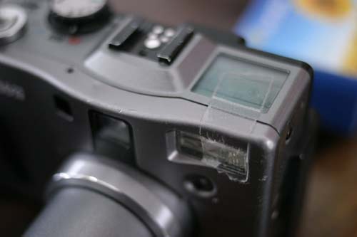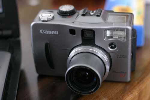 キヤノンのデヅカメ、パワァソットG1。ボロボロちゃんで、前の部分はねじが飛んで行って、剥がれかかっている。